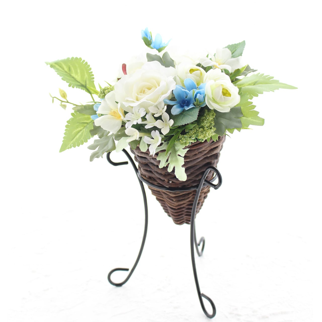 こげ茶色のバスケットを、黒いアイアンで支えています。